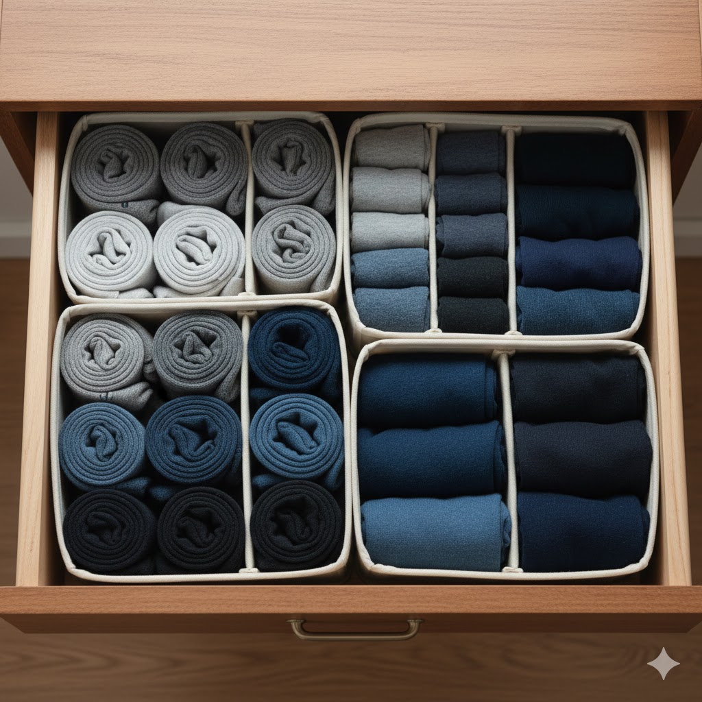 - 정리에 영 소질이 없는 가족을 위해, 같은 양말 여러 켤레를 사서 대충 말아넣기만 해도 꺼내 쓰기 편한 수납함 하나를 마련해주세요.